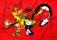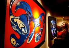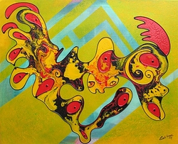 Ijmuiden - Galerie APF aan het Plein 1945 is er voor de feestdagen in geslaagd een opmerkelijke kunstenaar naar IJmuiden te halen. Erik Loman (42) uit Haaksbergen exposeert vanaf zondag tot 26 januari met een aantal van zijn opmerkelijke schilderijen. Kleurrijke werken met heldere fantasievormen en contrasten, duidelijk vormgegeven met vaart en trefzekere hand. Alle herkenbaar door hun driedimensionale karakter.