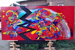 ERIK LOMAN MAAKT WERK VAN 2,5 TON!! Erik Loman, de Haaksbergse kunstenaar, bekend van het beschilderen van auto's, 'De Deure' en natuurlijk zijn schilderijen, heeft er een nieuw parade-paardje bij. Hij heeft nu een kunstwerk gemaakt op een automatische zaagmachine van Promatt ( www.promatt.nl ), die 2.5 ton weegt. Tijdens een gezellig treffen in de Twentse horeca raakte Erik met Wil Toebes (Promatt) aan de praat en het leek ze erg leuk om techniek en kunst samen te laten komen . Na wat heen en weer gepraat, werd er besloten om een zaagmachine, die metaal zaagt, te laten beschilderen door Erik. De zaagmachine werd voorzien van 12 lagen verf, de schildertechniek die hij altijd gebruikt en zo werd de machine een spetterend kunstwerk. De beschilderde machine heeft zijn eerste vuurdoop al gehad op de Metapro 2010 (9-2 t/m 12-2), een grote techniekbeurs in Brussel. Dat lokte meteen al reactie's uit van diversen mensen die de beurs bezochten, blij verrast om tussen de techniek door, in aanraking te komen met kunst. Verschillende meningen , verschillende reactie's en veel belangstelling was het gevolg . Een enkeling krabt achter zijn oor, want een machine is toch om mee te werken en niet om naar te kijken ? Het doel is bereikt: mensen kijken er naar en glimlachen, techniek en kunst komen samen. Tijdens de Techni-Show 2010 in Utrecht, is de machine/kunstwerk nog te bewonderen: (09-03-2010 tot 12-03-2010) Techni-Show 2010 Jaarbeurs Utrecht Hal 8, Stand B058 Metaalnieuws.nl Promatt laat Behringer zaagmachine beschilderen door Erik Loman. Tijdens de vakbeurs Metapro in Brussel (9 t/m 12 februari) presenteert Promatt een kunstwerk van de Nederlandse schilder Erik Loman. Niet op canvas, zoals gebruikelijk, maar op één van de tentoongestelde zaagautomaten van Behringer. 'De combinatie van kunst en techniek vond ik altijd al fascinerend. Tijdens een gezellige avond uit ontstond tussen Wil Toebes (directeur Promatt) en mij het idee, om van een zaagmachine een kunstwerk te maken.' Erik Loman is sinds jaren bekend door zijn bijzondere stijl. Hij schildert uitbundig in acryl, met gebruik van stevige kleuren. Zijn werken hangen in talloze galerie's in de Benelux. www.metaalnieuws.nl/site/nieuws/overige/4742/promatt-laat-behringer-zaagmachine-beschilderen-door-erik-loman.html www.erikloman.com