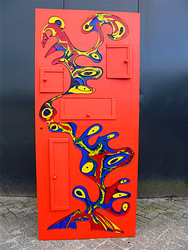 Erik Loman exposeert bij Catapult Van 1 december 2008 tot en met 31 maart 2009 exposeert beeldend kunstenaar Erik Loman zijn werken bij Catapult. Loman verwierf faam met de geverfde TV Oost deur, bekend van het programma van Willy Oosterhuis. Toch doet deze veelzijdige kunstenaar veel meer. Hij vervaardigt en beschildert ‘proatpoale' van hout, schilderijen op linnen doek, ‘boomkunst' en glasobjecten. Blij zijn we bij Catapult met zijn expositie. Maar ook zijn persoonlijkheid past prima in het ‘eigenwijze, creatieve en hartelijke concept'. Wie is Erik Loman? Wie Erik Loman aankijkt ziet, in eerste instantie een stoere, vriendelijke man. Al gauw blijkt dat je hem niet in een hokje kunnen stoppen. Als we dat al zouden willen. Naast die eerste indruk zien we gedrevenheid. Hij is geen kunstenaar ‘die wel ziet wanneer (en hoe) hij wakker wordt'. Bijna dagelijks is hij in zijn atelier in Haaksbergen te vinden. Aan ‘oppeppende' middelen doet hij ook al niet, piercings zijn hem vreemd. Alledaags is hij evenmin. Vol verve vertelt hij over zijn manier van werken. 'Ik beschilder alles waar verf op kan. Natuurlijk op linnen doek. Van 30 x 20 centimeter tot 1.50 x 2.00 meter. Maar ook op glas, auto's (met toestemming), en ‘proatpoale' van hout. De TV-Oost deur, ‘achtervolgt' mij. Prima hoor. Maar ook erg leuk om te doen was met een grote, omgewaaide boom aan de slag te gaan. Een houtkunstenaar maakte er een speeltoestel annex bank van. Met honderd kinderen hebben we er een kleurtje aan gegeven. Het was voor mij bijzonder omdat het mijn oude basisschool was.' ˜Nee' leren zeggen 'Voordat een doek klaar is ben ik veertien dagen verder. Met een piramidevormige kwast zet ik eerst dikke zwarte lijnen op doek. Dat moet in één keer goed gaan. De ontstane vlakken kleur ik in met verf. Hier heb ik een middel aan toegevoegd dat de verf dikker en steviger maakt. Ik werk met drie tot elf kleuren. De dikke verf moet uitharden. Om een schilderij af te maken ben ik er gemiddeld twaalf dagen mee bezig. Als alle lagen gedroogd zijn polijst ik het doek handmatig. Daarna breng ik drie lagen vernis aan. Het werk krijgt daardoor een geëmailleerde en glasachtige uitstraling. Niet elk werk vind ik mooi. Soms verdwijnt het naar de stort. Maar dan wel in stukken gesneden. Ik wil niet dat het ergens opduikt. Afscheid nemen van een werk blijft lastig. Ik verkocht een doek dat nog ‘nat' was. Per ongeluk eigenlijk. Er was iemand in het atelier die het aansprak. Natuurlijk ben je er trots op, aan de andere kant wil je het nog niet meteen kwijt. Werken in opdracht vind ik lastig. Ik leer er ‘nee' tegen te zeggen. Mensen hebben een ‘plaatje' in hun hoofd. Dat is moeilijk werken. Het belemmert je ook.'
